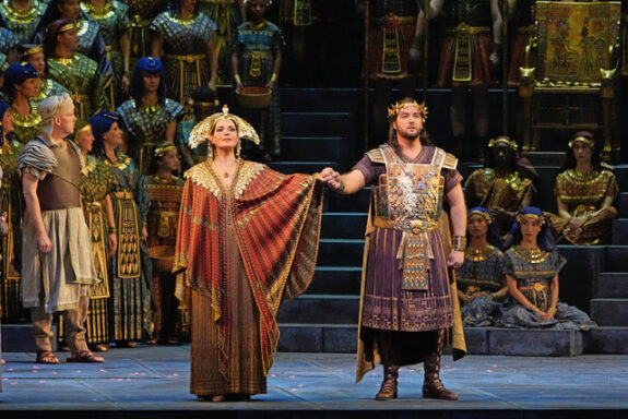 It is a grand production with rich architectural details and monumental sets. The Triumphal March is awash in color and full of spectacle as Egyptians and their Ethiopian captives fill the stage. Scene changes are quick and seamless, especially the final one in which the tomb where Aida and Radamès will die rises from the depths on the Met’s stage elevators.