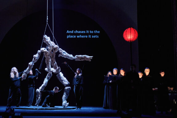 There was more drama in one of those songs than there was in the whole of Book of Mountains and Seas, the second of the festival’s two staged operas, though calling it an opera is stretching it a bit. Premiering in 2021, it is more of a staged ritualised mythology, setting four Chinese creation myths using two percussionists, the twelve singers of Ars Nova Copenhagen and six puppeteers, directed by Basil Twist and all marshalled under the banner of Beth Morrison Productions.