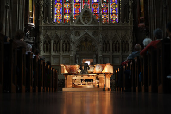 Visually, little has changed, although the 23.5 karat gold leaf gilding on the facade pipes is eye-catching. The number of pipes has increased from 5,000 to 8,041 pipes with 113 independent stops and 138 ranks. The majority of the organ’s features are housed in the rear gallery in Richard Upjohn’s 1846 case, while the ones in the chancel have undergone minor modifications for acoustical purposes. Lapwood performed on the mobile console, with its intricately carved woodwork, positioned in front of the chancel.