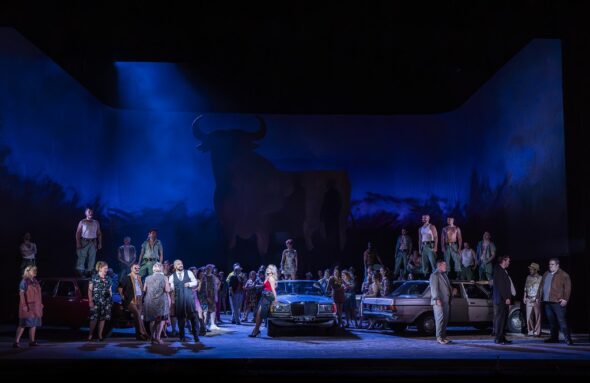 This being a Bieito production, there is much emphasis on and depiction of the sexual shenanigans between the characters, but not violently portrayed, so there is nothing unsavoury. There is much thrusting, a lot of testosterone obvious in the male soldiers, a lot of banging, screaming and rushing about, but no real passion; Carmen can be a beautiful, seductive opera but not in this over-produced production. There is also little Spanish about the set, apart from the Spanish flag, the word ‘Telefono’ on the telephone box and a huge Osborne bull which crashes noisily and spectacularly in the third act (but why?). If you are a fan of vintage cars, the parade of six old Mercedes automobiles, with Spanish numberplates, is a joy to behold.